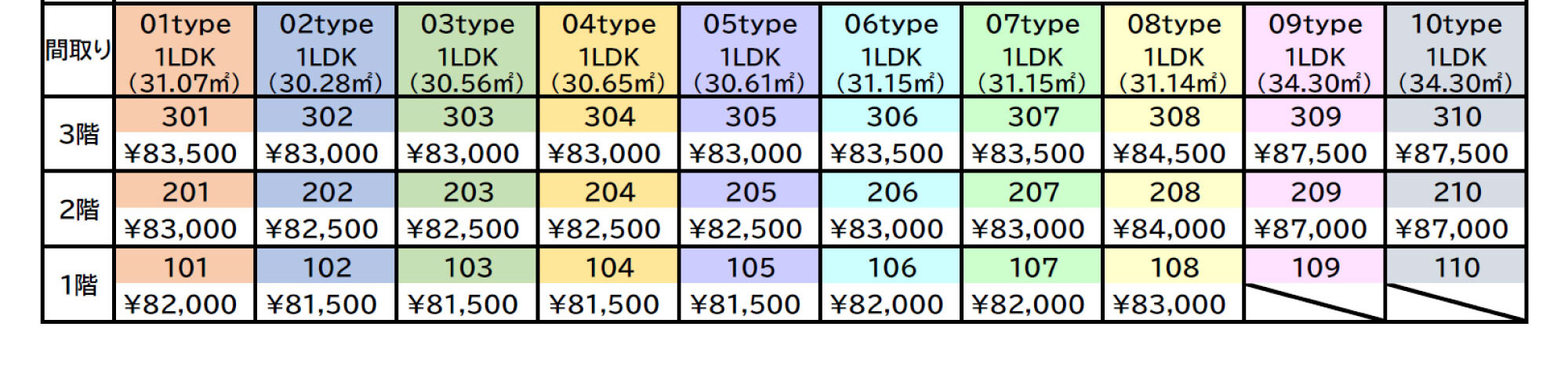 | 設備 | エアコン1台/クローゼット/2口キッチン/室内洗濯機設置可/洗面所独立/脱衣所/洗面化粧台/温水洗浄機能付暖房便座トイレ/テレビモニター付きインターフォン/都市ガス/公営水道/下水/オートロック/宅配ボックス/インターネット無料/ CATV利用料無料/駐輪場 |