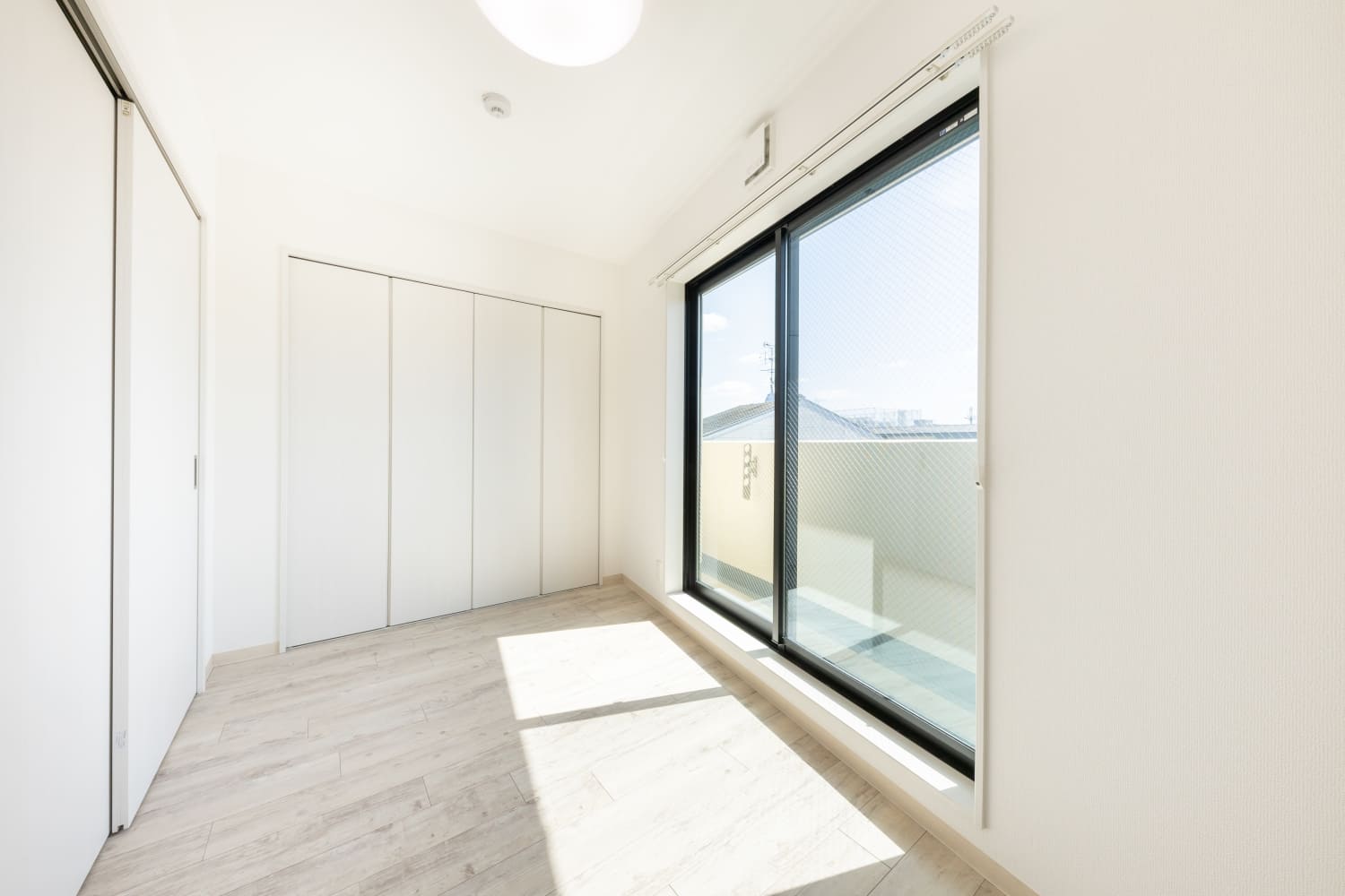 大きな窓から光が広がる、明るく心地よい一室。白基調にナチュラルな木目が映える、上質な空間。