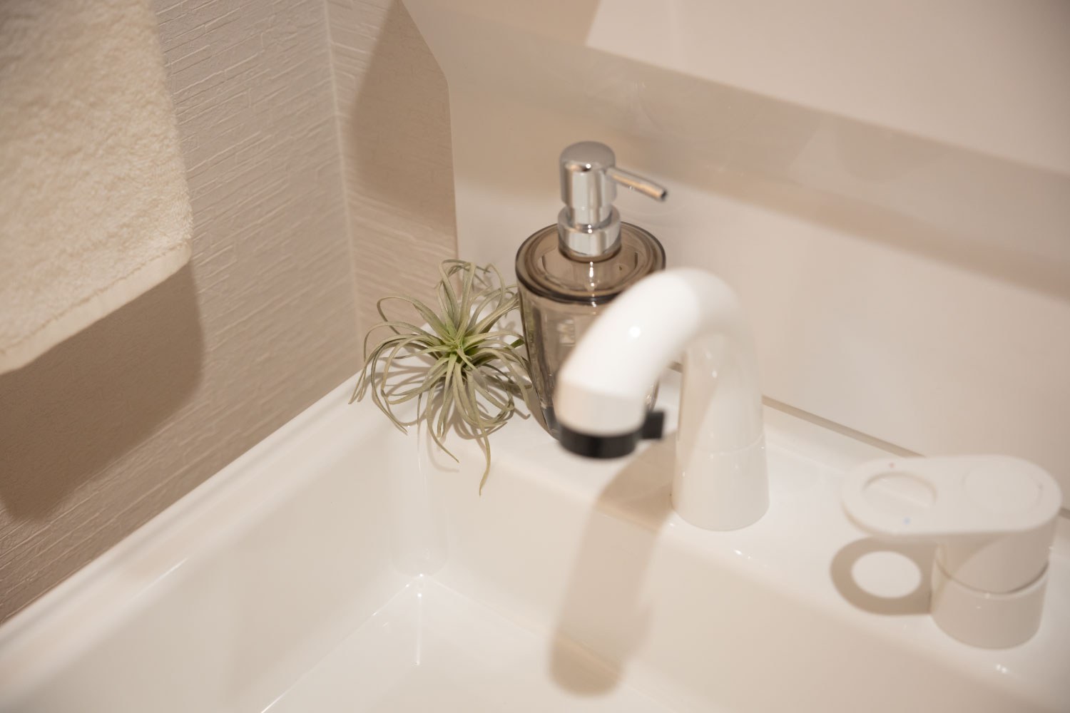 水栓はシャワーホースを内蔵したリフトアップタイプ。清掃や加湿器タンクの給水などに役立ちます。